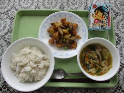 麦入りご飯 かみかみチキンチキンごぼう ABCスープ 牛乳