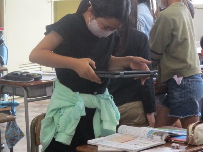 続いて、4年生。社会科の学習で活用し始める場面に出会いました。検索機能を使ってネットで調べる児童もいましたが、撮影機能を使って教科書や資料集のページを画像として取り入れている児童もいました。発表の時に活用するのでしょうか?