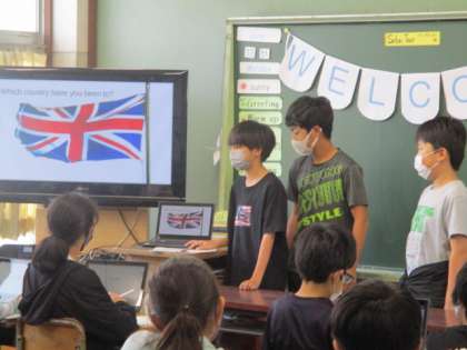 そして、今日。県外出張から帰って4日ぶりの学校です。たまっていた文書やメールもたくさんあったので、文書処理をしたり、メール対応をしたりで、半分の学年・学級しか回ることができませんでした。そのような中、6年生の外国語の授業で、クロームブックを活用している場面に出会いました。外国のことを調べて、スライドにし、英文も入力して、英語で紹介しあうという高度な授業です。調べたい国ごとにグループを作り、紹介したい内容に合う写真をネット上で見つけ、スライドにし、さらに紹介する内容を英語で表現していました。それを大型テレビに映し出し、みんなの前で英語で紹介していました。ちょっとしたプレゼンテーションです。