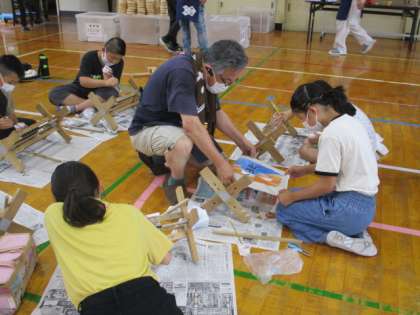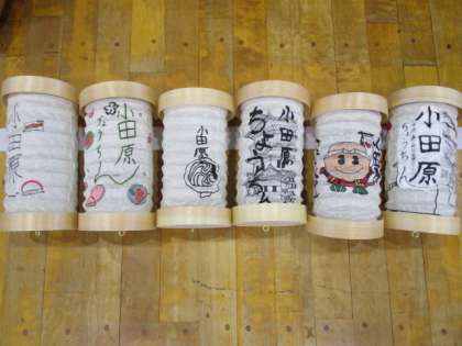 事前に図工の時間を使って、和紙に「小田原を象徴するもの」を一人一人描きました。今日は、骨組み作りからです。竹ひごにテープをつけて、台座に竹ひごを巻いてテープでしっかり止めます。12本の竹ひごを巻いたら、台座を横にして、接着剤を筆で少しずつつけていきます。そして、自分が描いた和紙を貼っていきます。ぐるっと1周貼れたら、台座を取り外し、上下に枠を取り付けて完成。