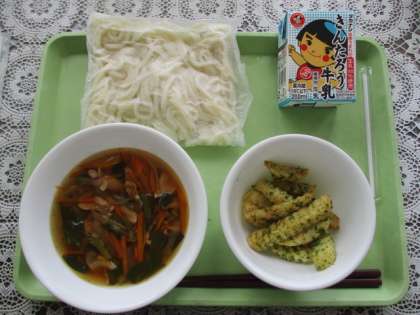 今日は、肉や野菜が入った肉南蛮うどんです。