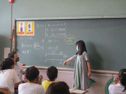 本時の問題は、一昨日の3組と同じ「2Lで390円のジュース、1.8Lで360円のジュース…どちらのジュースが安いかな?」です。単位量当たりの大きさに注目すればいいのではということになり、390÷2と360÷1.8の2つの式を立てることができました。ここで、児童とともに今日の課題を決めます。児童の声をもとに1組では「整数÷小数の計算方法を考えよう」となりました。
