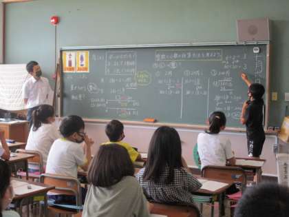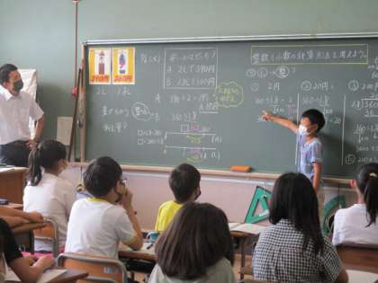 本日も、4校時目に校内研究の学年ブロック研究がありました。5年生の算数「小数のわり算」の授業研究です。