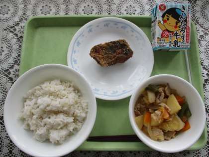 麦入りご飯 鰆(さわら)のカレー醤油焼き 野菜の生姜煮 牛乳