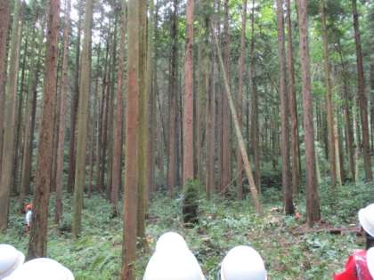 少し雨が降り始めてきましたが、見学には支障がありませんでした。背の高い木を伐採するところを目の前で見ることができました。木が倒れた瞬間、子供たちからは思わず歓声と拍手が沸き起こっていましたが、私も目の前で直接見るのは初めてで、子供たちと同じような反応をしていました。林業の話に加え、森林を散策しながら、森林に関する話や特徴のある葉や木の実などの話も伺いました。ヒノキなどの木の香りをかがせていただいたり、安全な木の実や枝などの味を確かめさせていただいたりと、五感をフルに使っての森林体験です。