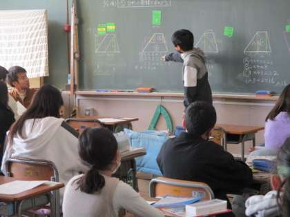算数の時間、これまで学習してきた三角形や長方形などの図形の面積の求め方をもとに、台形の面積の求め方を考えました。