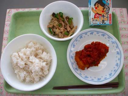 牛乳 麦入りご飯 イカフライチリソースがけ きのこともやしの中華炒め