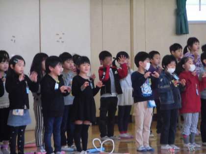 10日(金)に、下学年の朝会がありました。今回は、1年生が中心となった音楽朝会でした。手話を交えた「さんぽ」、次に、ドレミパイプを使った演奏(1組「きらきらぼし」、2組「ロンドン橋」、3組「かえるの合唱」)、最後は、全員で鍵盤ハーモニカや鉄琴、タンバリンなどの楽器を使った「こいぬのマーチ」を披露してくれました。この1年間の心の成長を感じることができました。