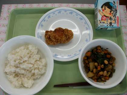 牛乳 麦入りごはん 鶏肉のレモン揚げ 五目煮