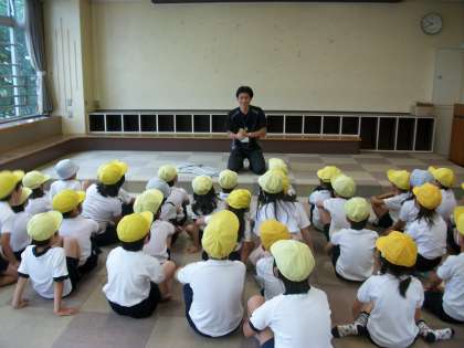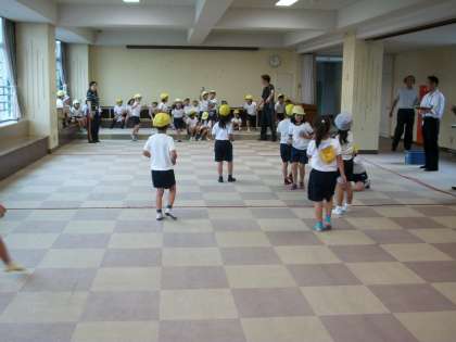 「おにあそび」の予定でしたが,室内ドッジボールに変更でした。ドッジボールの代わりに「新聞紙」を丸めて行いました。当たらないように逃げる,拾っては投げるなど元気いっぱいの活動でした。当たってしまうと座るのですが「リーダー」にタッチされると復活できるあたりは,鬼ごっこの要素も盛り込まれていました。