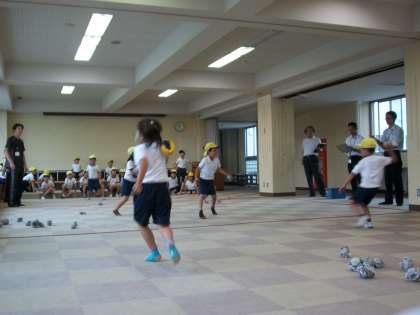 3分間のゲームを行っていました。次のゲームに向けて話し合いをしました。勝つためには「逃げながら丸めるといい」や「タイムをして丸める」などアイデアがでました。