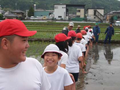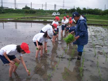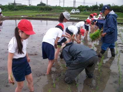 6月11日(水)田植えの体験をしました。クラスごとに1時間ずつ体験をしました。小雨でした笑顔で体験できました。