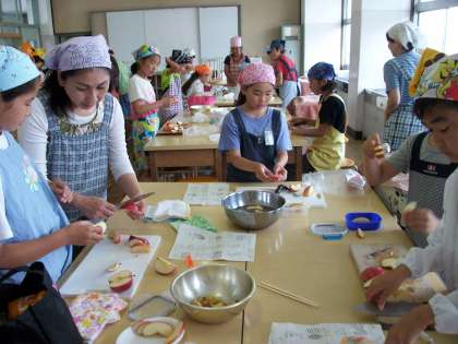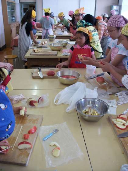 前回紹介できなかった料理クラブです。ボランティアさんの協力を得て行っています。今日はリンゴの飾り切りに挑戦していました。見事な包丁さばきでした。