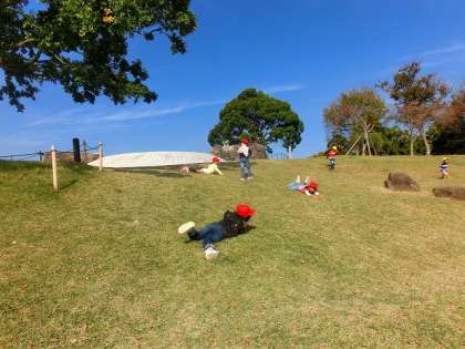 あづま山では,アスレチックをしたり滑り台をしたりしました。芝生で転がるのも楽しかったです。背中についた芝を取り合う(う)美しい姿もありました。