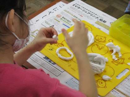 図工の時間に、伸ばした粘土を使っていろいろな形の造形をしました。カタツムリやペロペロキャンディー、縄文式土器やモンブランなどいろいろな作品ができあがりました。独創的な作品がたくさんありました。一生懸命に粘土を伸ばして、長く長くしようとしていました。