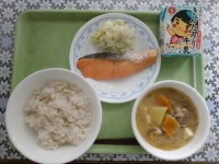 麦入りご飯 牛乳 鰹のごまみそかけ じゃがいものそぼろ煮