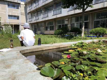 6年生は図工で、6年間通った思い出の校舎の絵を描いています。校舎には、自分の好きな花を添えています。