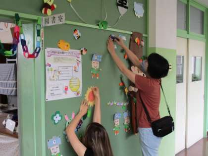 スクールボランティアの図書ボランティアの皆さんが、2ヶ所の図書室前の廊下壁面に、色紙やフェルトなどで作ったかわいい装飾を飾り付けてくださいました。