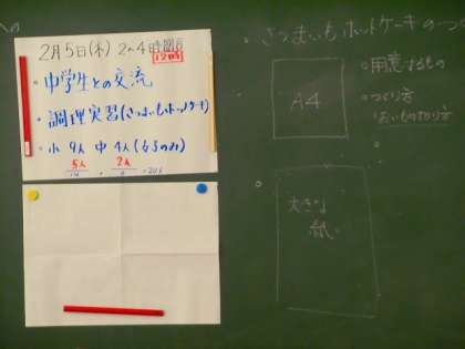 「・・・料理」をおもてなしで出すために,道具や材料について「フライパン」・「計量カップ」など発表をしていました。一人一人が必要なものを発表できました。
