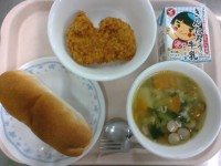 献立・牛乳・黒パン・ポークケチャップ・キャロットスープ・豆乳プリンタルト ポークケチャップは前回、ごはんのおかずとして出しましたが、今日はパンとあわせました。汁気が多くありましたが、パンに挟んで食べて...