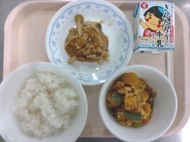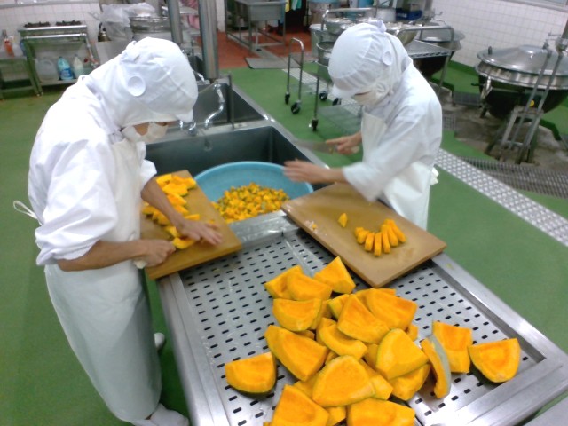 たくさん収穫できたかぼちゃを使用するため、里芋からかぼちゃに変更となりました。かぼちゃは煮崩れしやすいですが、大量調理でも調理員さんが上手に作ってくれ、形を残した状態で子どもたちに食べてもらうことができました。