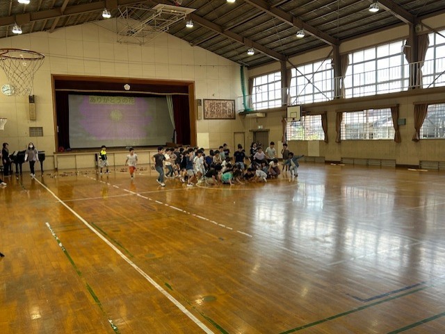 10月2日(木)の朝にシェイクアウト訓練(予告なし)を行いました。この日は音楽朝会の日でした。発表の3年生は、訓練の時には発表のリハーサルの最中でした。訓練の放送が流れた瞬間に元気よく歌っていた3年生は、歌うのをやめて体育館の中央に集まり座っていました。