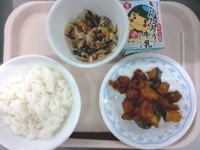 金曜日に出たかぼちゃのおかずと似ていますが、今日は豚肉がたっぷり入っているので、ごはんが進むおかずです。今日も学校農園のかぼちゃを使用しています。育てた4年生からは「かぼちゃってまだあるの〜!?」と驚きの声がありました。