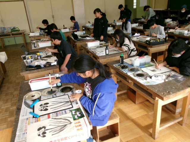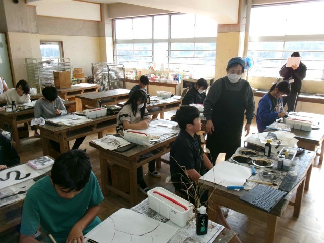 6年生が講師の先生をお呼びして、先週・今週と2回に分けて水墨画に挑戦しました。先週は線の描き方・濃淡のつけ方・滲ませ方を教えていただきました。今週18日(火)はいよいよ自分の描きたいものを描きました。植物や動物・食べ物など、子どもたち一人ひとり描きたいもの描きました。水をたくさん含んで滲んできたり墨の量を減らしかすれたりして、よく描けていました。出来上がりに満足している子も多くいました。