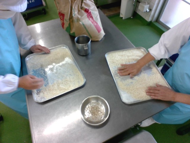 来週の久野小産のもち米を給食で使用する準備として、今日から米の点検が始まりました。一週間かけて調理員さんが米の中に石やその他の異物がないか丁寧に確認します。