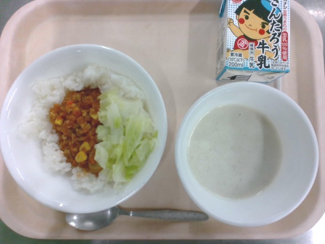 献立表には「さつまいものポタージュ」と記載がありますが、学校農園で収穫した里芋を使用するため、「さといものポタージュ」に変更になりました。久野小では、にんじん、じゃがいも、さつまいも、かぼちゃ、様々なポタージュを給食で出しますが、里芋は初登場でした。どの学年からも大好評でした。