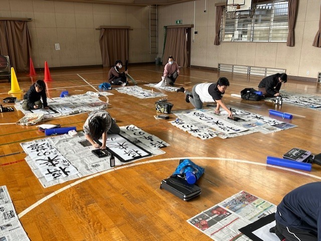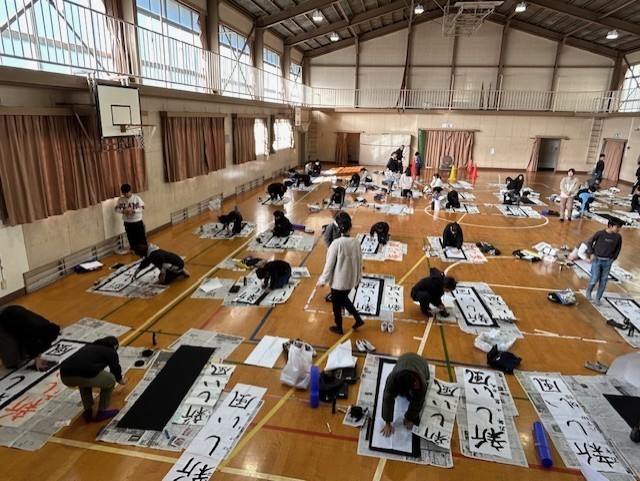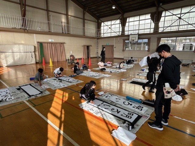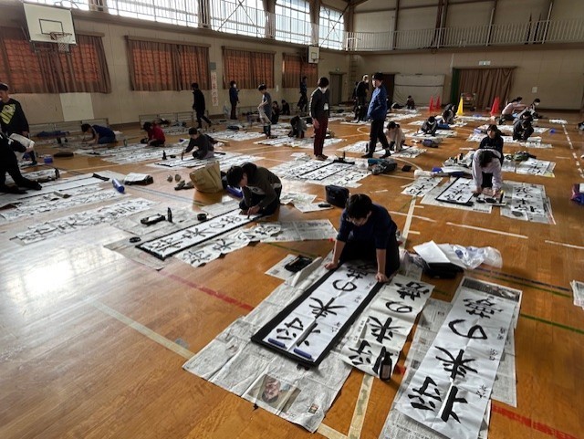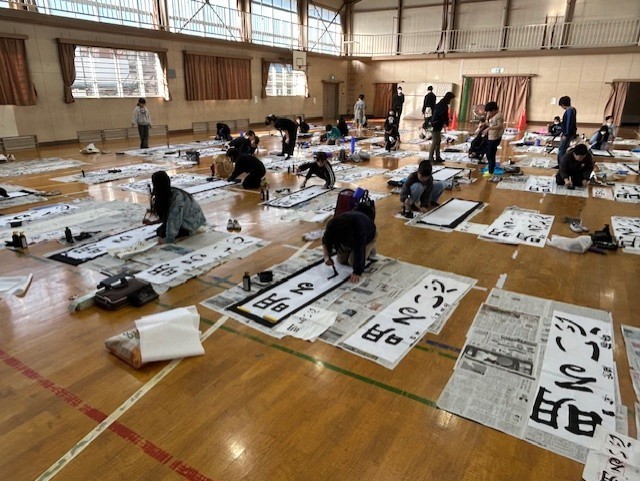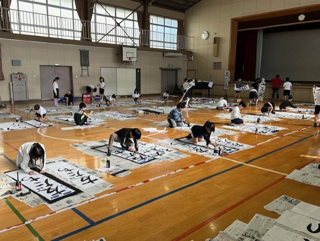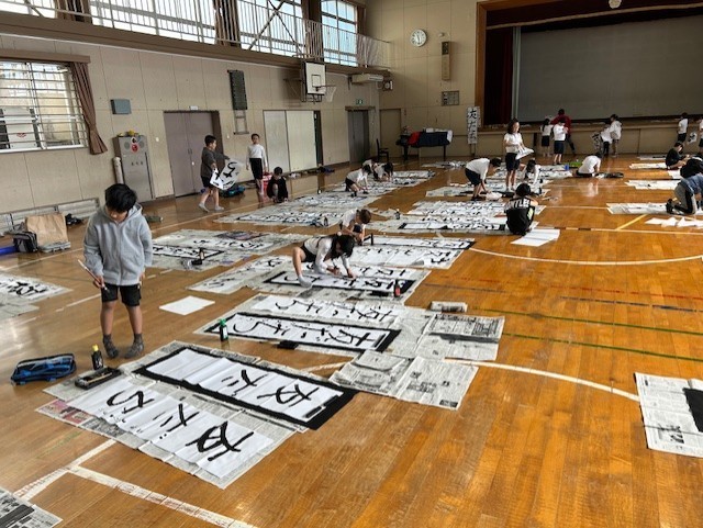 子どもたちは、一文字一文字集中した顔で丁寧に書いていました。体育館は、集中した静けさと墨の香りが広がりとても気持ちのいい空間でした。