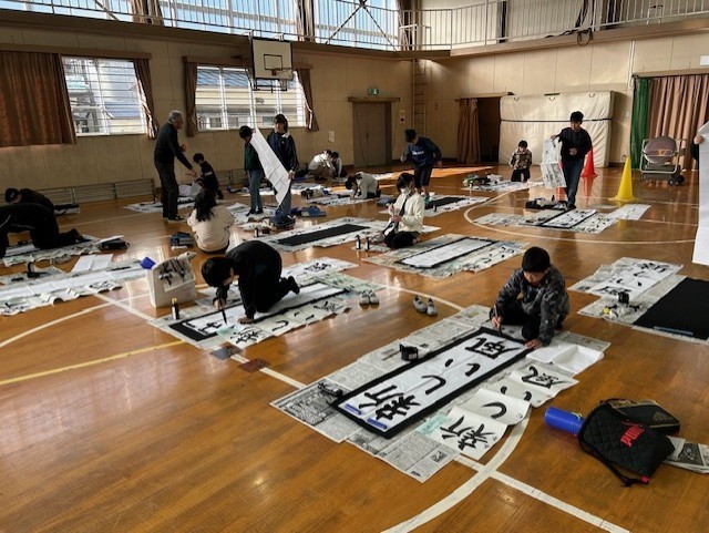 1月9日(金)に5・6年生、13日(火)に3・4年生が体育館で毛筆を使い書き初めを行いました。