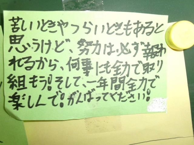 6年生の授業を参観しにいき、教室内の掲示物を見ていると、温かなメッセージを見つけました。これは令和7年度の卒業生が、春休みに学校に遊びに来た際に教室に残していったものだそうです。新6年生に向けてのメッセージです。卒業してもなお、久野小学校のことを考えてくれた優しい子たちです。嬉しいです。