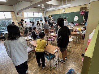 最後の写真は、新6年生が新1年生の教室で朝の準備のお手伝いをしているところです。