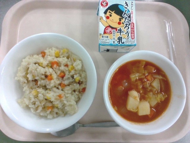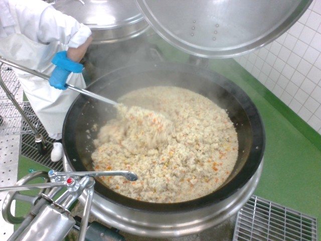 コーンピラフは給食室でアルファ化米という米を使って作っています。全校分を混ぜるのは大変な調理です。