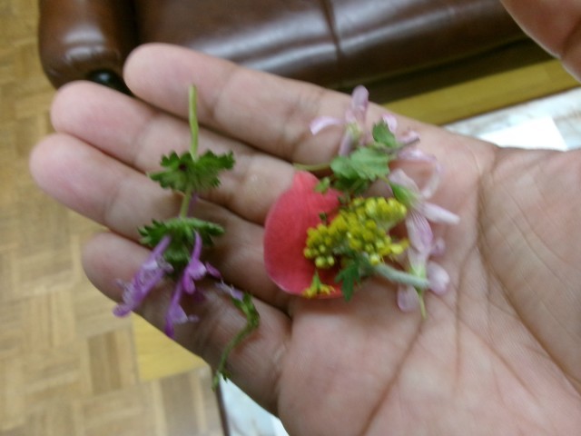 校長室の入り口を開けて仕事をしていると、1年生から、「これから春さがしに行ってきます。」と声をかけられました。私も「あとで何を見つけたか教えてね。」と答えました。授業が終わり、教室に戻るときに「校長先生、いっぱい見つけたよ。お花も咲いてたし、いい匂いの実(梅)も落ちてたよ。」と見せてくれました。そして、「ちょっとだけだけど、あげるね。」とお花をプレゼントしてくれました。週の終わりに嬉しいプレゼントをいただきました。