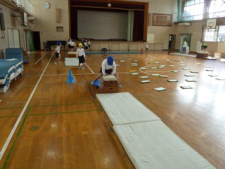 1年生、体育をしていました。マットや跳び箱を使って、いろいろな跳び方をしていました。みんな楽しそうに体を動かしていました。