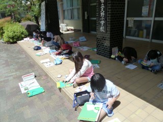 4月25日(月)、5年生が昇降口や前庭で絵を描いていました。5年生の図工は、鈴木先生が担当しています。5年生は、ちぎった画用紙に桜の木などそれぞれ好きなものを絵の具を使って描いていました。