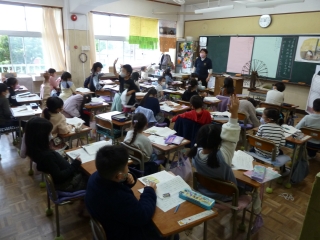 11月28日(月)、1年生は国語の物語文「たぬきの糸車」の学習をしていました。教室には大きな糸車と障子が用意されています。1年生は、たぬきとおかみさんの気持ちを考え、物語の場面を想定し糸車を回したり障子の穴からのぞいたりして発表しました。進んで発表できる子がいて、すばらしいですね。