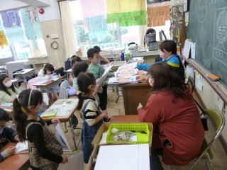 2月8日(水)、1年生が集中して誰かの似顔絵を描いていました。もうすでに先生の確認を済ませて描き終わった子もいました。さて、1年生は誰の似顔絵を描いていたのでしょうか?