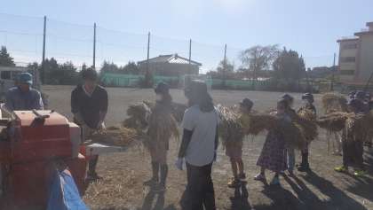10月24日(火)、5年生は、先日稲刈りした稲を脱穀しました。今回も農園ボランティアの方に脱穀機を用意いただき、実施することができました。稲は、稲刈り後、フェンスに干しておきましたが、ずっと天気にも恵まれ、太陽の栄養をたくさん蓄えたと思います。