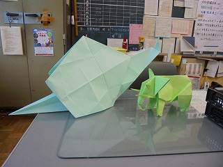 先生の学生時代の出来事から、折り紙の話を聞きました。ツルやカタツムリ、スペシャル折り紙のゾウなど子どもたちからは感嘆の声があがりました。さらにシークレットの動物がいるという話を聞きみんなワクワク顔でした。