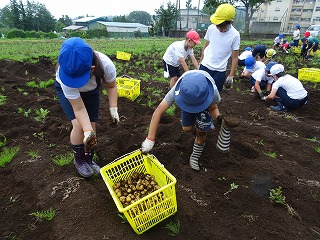 3年生が、じゃがいもの収穫をしました。暑さにもまけず、みんなで協力して一生懸命掘りました。267キログラムもとれました。おいしく食べるのは、いつでしょう。