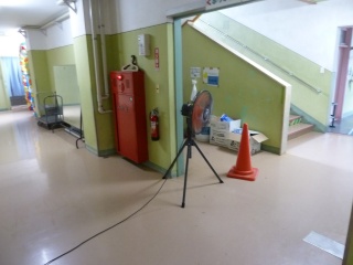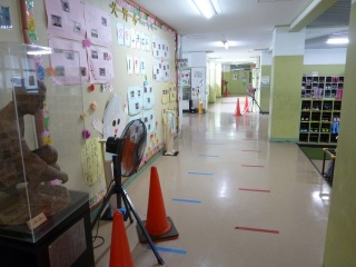 今日は、雨の中の登校でしたが、久野っ子は普段通り落ち着いて登校できました。雨の日は、外で手洗いするのではなく昇降口に向かい手指消毒をしてから教室に行きます。その流れもわかっているようで、正門で「今日は、昇降口で消毒してね。」と声をかけるとすぐに「はい。」と返事をする児童も多くいました。そして、校内では湿度が高くなり、廊下が結露で濡れていました。廊下で滑ってけがをしないように校務用員の青木さんが大型の扇風機を結露のひどい1階廊下に設置してくれました。青木さんに感謝です。今後も全職員で安全・安心に過ごしていけるようにしていきたいと思いました。