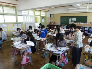 6年生が図工で絵を描いていました。図工は、瀬戸教頭先生が担当しています。6年生は、肌の色は絵具の組み合わせを考えながら作ったり、髪の毛を一本一本丁寧に描いたりしていました。さすが6年生、絵も上手でした。教頭先生も、褒めていました。