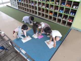 1年生が、紙と色鉛筆をもって