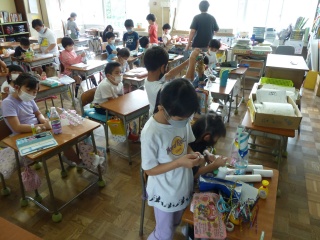 2年生が音の出る楽器づくりの続きをしていました。