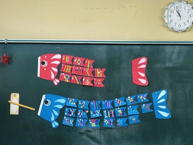 1つ目はたんぽぽ級の黒板に掲示された鯉のぼりです。うろこの部分がミニ鯉のぼりになっています。自立活動の際に作られたものです。シールの数を数えたり、丁寧に張ったりして仕上げました。ミニ鯉のぼりをみんなで作って大きな鯉のぼり素敵です。