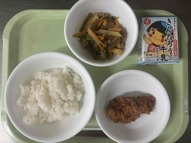 今日の献立は、牛乳 ごはん 鶏肉のから揚げ 小松菜入りきんぴら です。