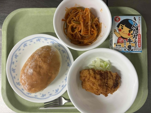 今日の献立は、牛乳 ソフトフランスパン 白身魚のフライ ボイルキャベツ トマトスパゲッティ です。